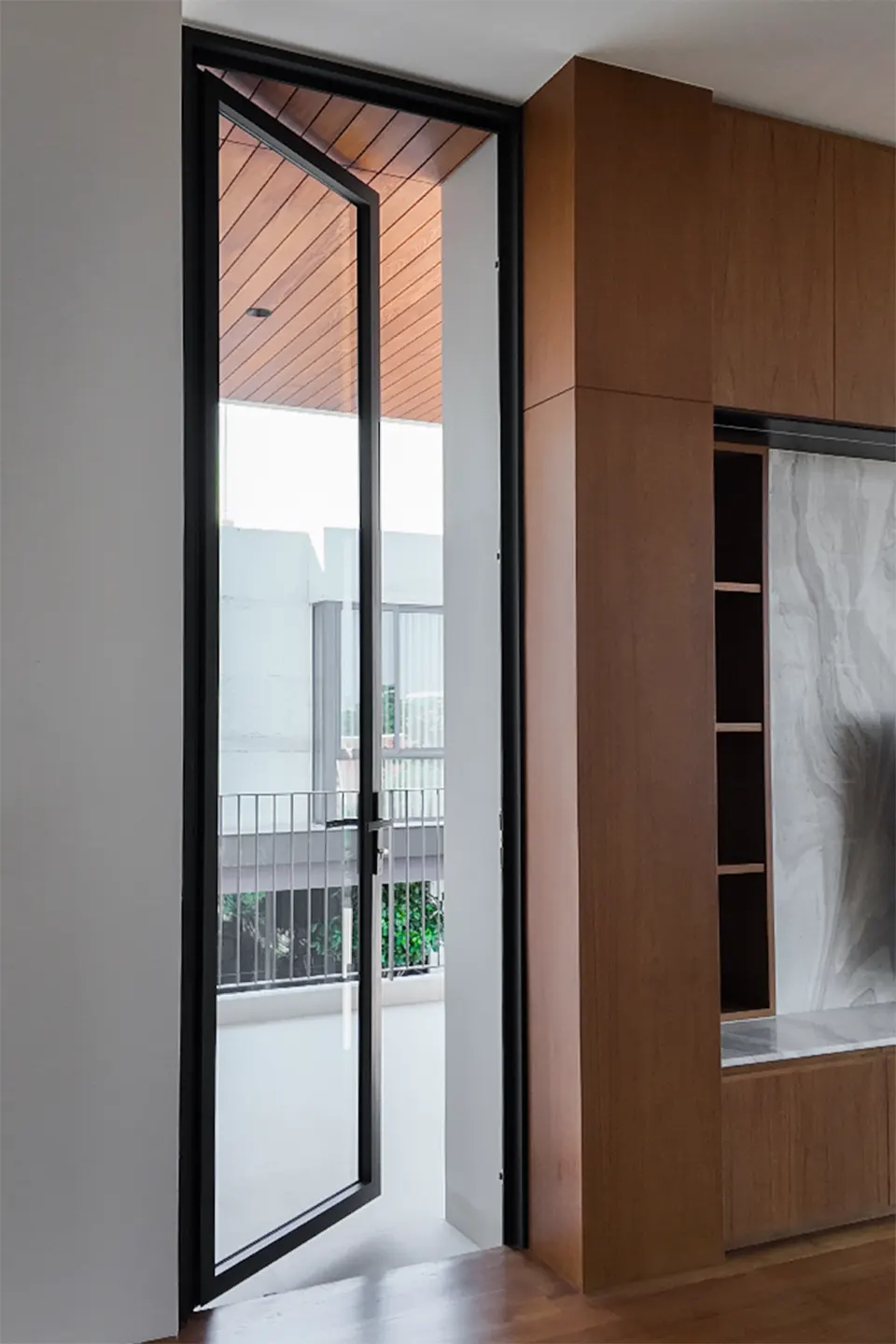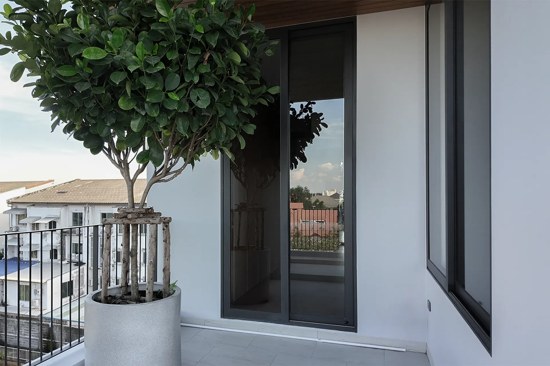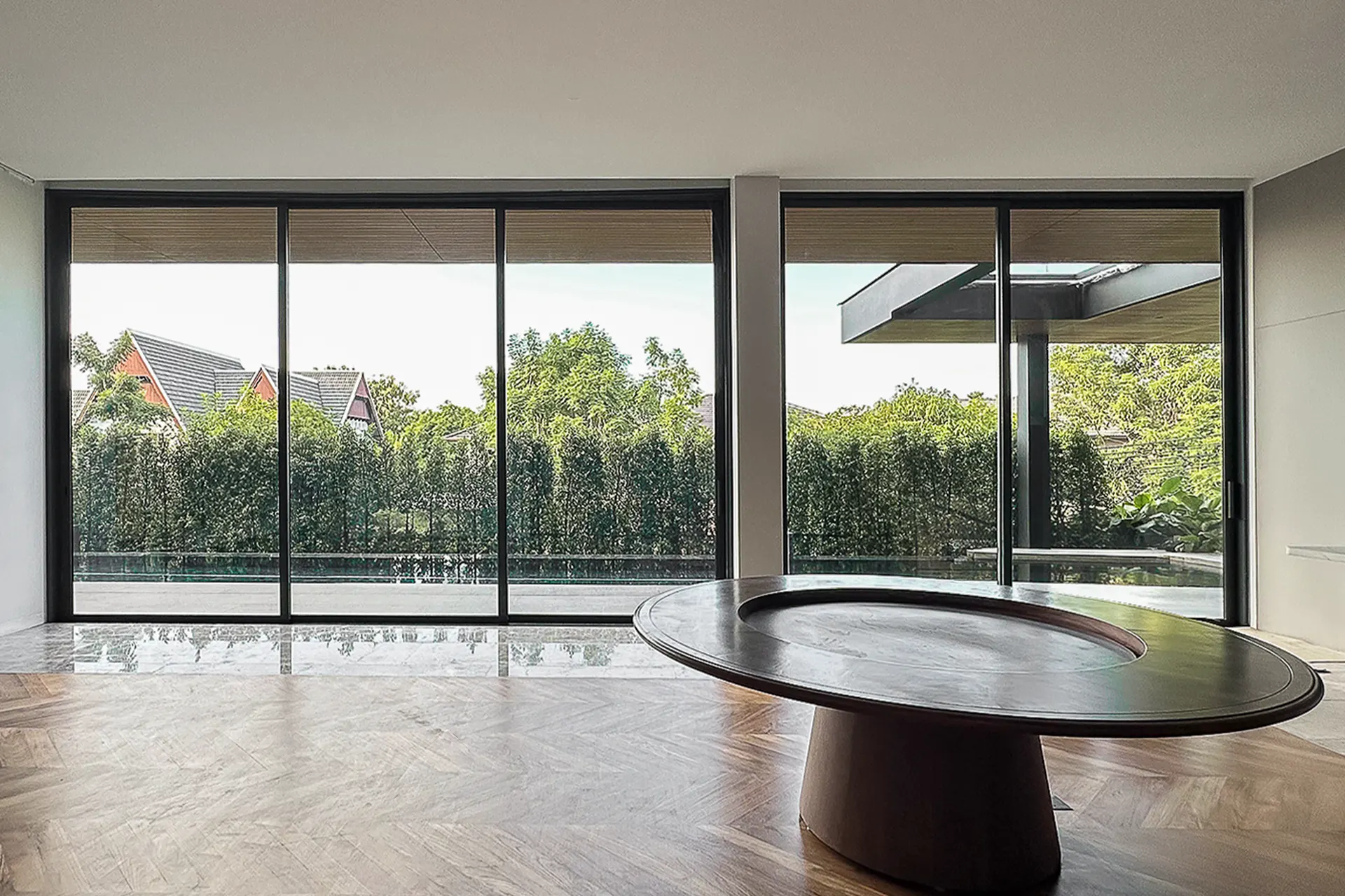 หนึ่งในองค์ประกอบสำคัญคือการใช้ บานประตูและหน้าต่างขนาดใหญ่ เพื่อรับแสงธรรมชาติให้ได้มากที่สุด เทคนิคนี้ช่วยให้บ้านได้ Mood & Tone ที่อบอุ่น โปร่งโล่ง และรู้สึกเชื่อมต่อกับธรรมชาติภายนอก เหมาะอย่างยิ่งสำหรับบ้านที่มีสระว่ายน้ำ มุมสวนหรือพื้นที่สีเขียวในบ้าน